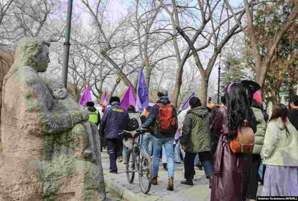 В Бишкеке 8 марта в Международный женский день прошел марш за права женщин. Шествие под лозунгом «Жизнь женщины – зеркало времени» началось от памятника борцам революции на проспекте Чуй и завершился в сквере имени Горького по улице Исанова.